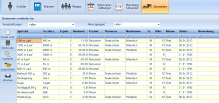 Das Programm BJSp ist eine Software, die Sie bei den Bundesjugendspielen im Bereich Leichtathletik unterstützt. Sie können damit die Leistungen Ihrer Schüler erfassen, bewerten und deren Ergebnisse für die Erstellung von Urkunden oder zur Benotung verwenden. Die Leistungen lassen sich nach verschiedenen Kriterien sortieren und auch selektieren (wie z.B. Wettkampf, Klasse, Riege, Geschlecht, Jahrgang, Punkte usw.). Dadurch können u.a. die jeweils Schuljahresbesten ermittelt und in eine fortlaufende Schulrekordliste eingebunden werden. |