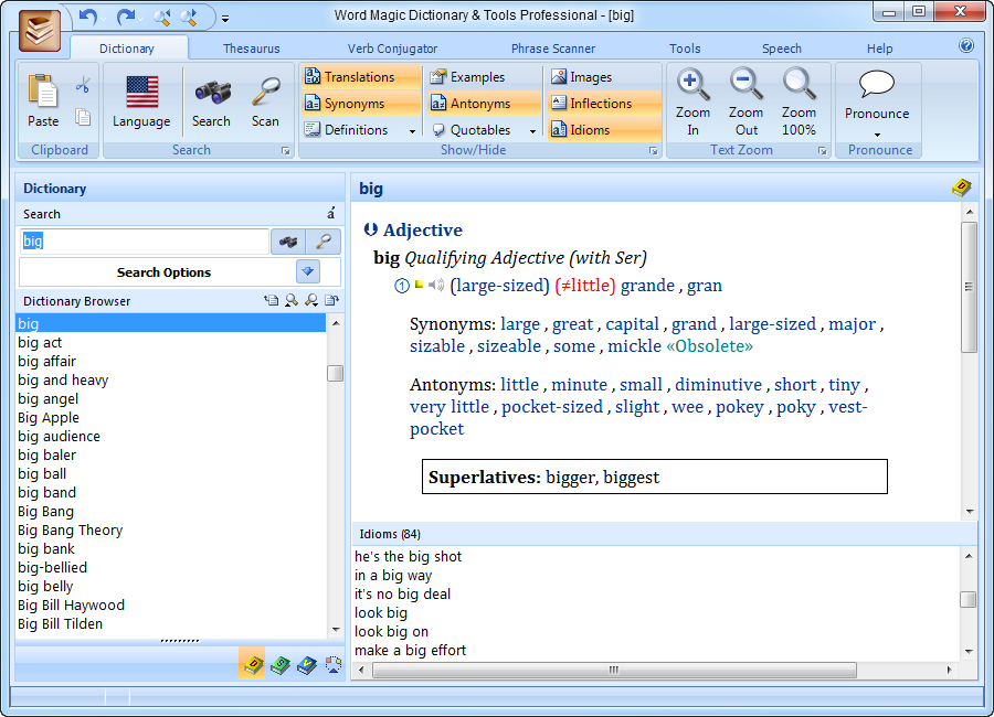 | Word Magic Software | Dictionary & Tools Professional 6.0: A Mega Dictionary with translations, idioms, synonyms, antonyms colloquial and regional tags, etc. The program also includes a Double Thesaurus, which mirrors all words related to your search word in both languages, a Double Conjugator, which likewise mirrors all conjugations of your search verb in both languages simultaneously, a Reverse Conjugator, which provides you with the root of your conjugated search word (verbs, plurals, augmentatives and diminutives), and a Phrase Scanner, which looks up all phrases that have your search word included. These are just a few of the staggering features in this state-of-the-art dictionary...Four unparalleled programs in one. |