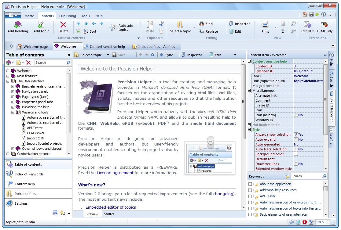 It focuses on the organization of existing html files, xml files, scripts, images and other resources so that the help author has the best overview of his project. Precision Helper works natively with the Microsoft HTML Help projects format (HHP) and allows to publish resulting help to the CHM, WebHelp, PDF and the single html document formats. Precision Helper is designed for advanced developers and authors, but user-friendly environment enables creating help projects also by novice users. |