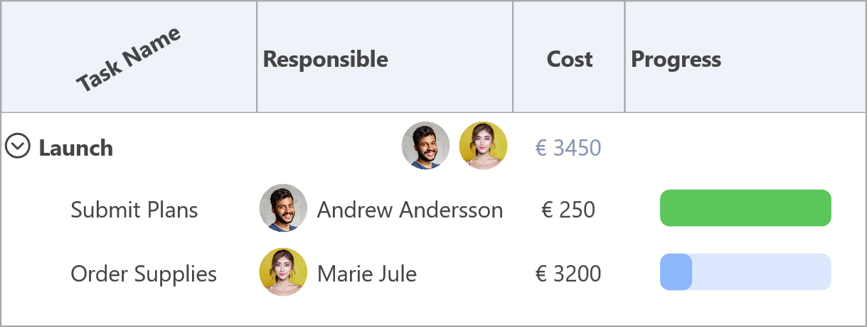 Predefined strings like wbs, taskname, taskdescription, startdate, enddate, duration, statename, progress, dependencies, datastring, datainteger, databoolean and cost offer you a plethora of options to enrich the tasklist with relevant data, transforming it into a powerful visualization tool.