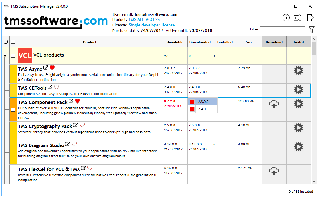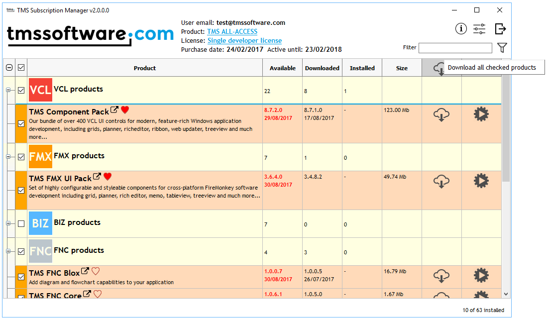 One comprehensive tool to manage any of the many bundle subscriptions you can purchase from TMS software was our goal for TMS Subscription Manager v2.0 that is now finally released. TMS Subscription Manager v2.0 supports TMS ALL-ACCESS, TMS VCL Subscription, TMS Business Subscription, TMS Component Studio, TMS FMX Component Studio, TMS FNC Component Studio and TMS IntraWeb Component Studio.With TMS Subscription Manager v2.0, you can use a single login in this application and you get instant access to all products in the purchased bundle. For TMS ALL-ACCESS, this is at this moment a whopping 63 products. The TMS Subscription Manager v2.0 now categorizes the products neatly per technology : VCL, FMX, BIZ, FNC, DEV, .NET, IntraWeb and LCL.