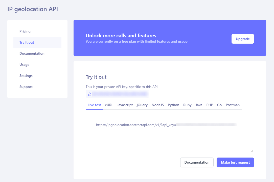 - When you select IP geolocation, you will see your API key.