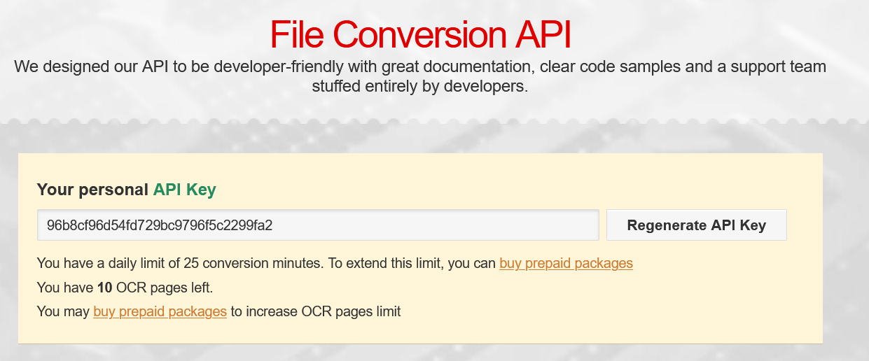 Go to https://developers.convertio.co/ and sign-up to create an account.You will immediately receive an api key.
