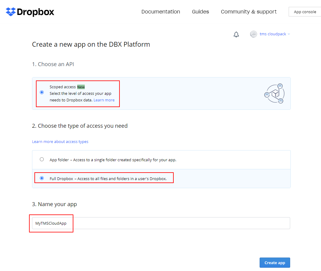 To create an application for DropBox, you'll need a DropBox account. Login and request the application key and secret via the link: https://www.dropbox.com/developers/apps