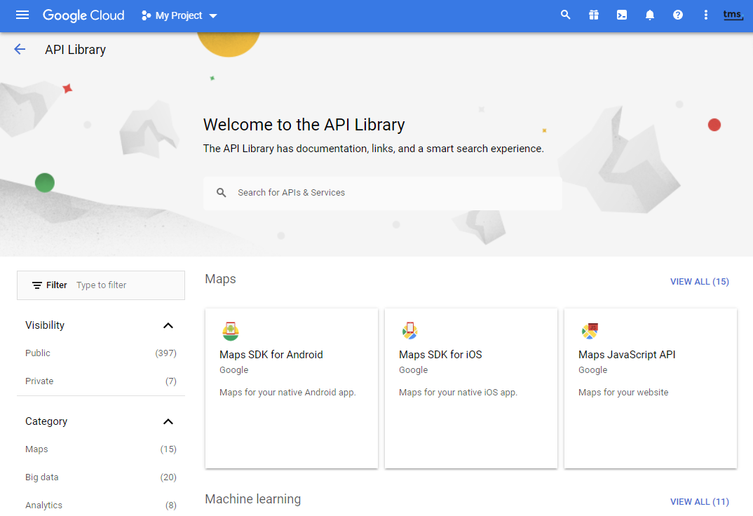 - From the top-left menu 'APIs & Services' choose 'Library'. Select the required APIs one by one and enable them.