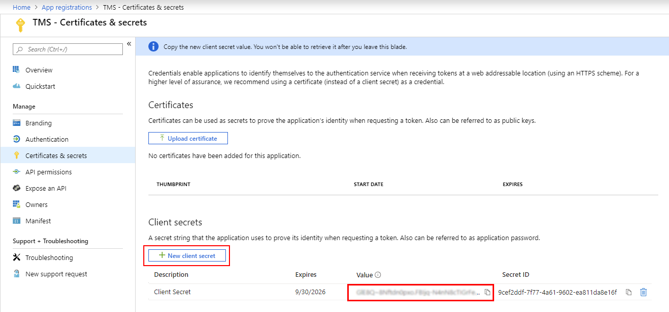 - Click "Certificates & secrets" in the menu on the left