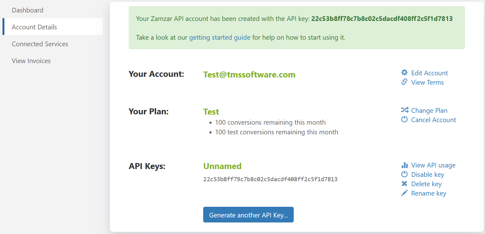 Go to https://developers.zamzar.com/ and sign-up to create an account.You will immediately retrieve an api key.