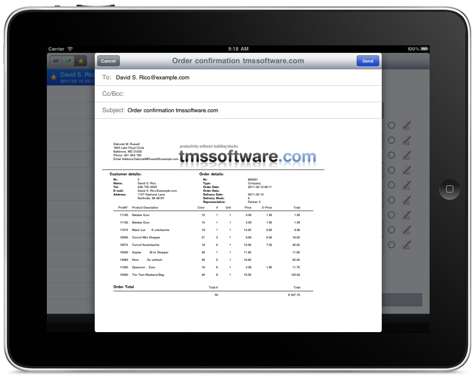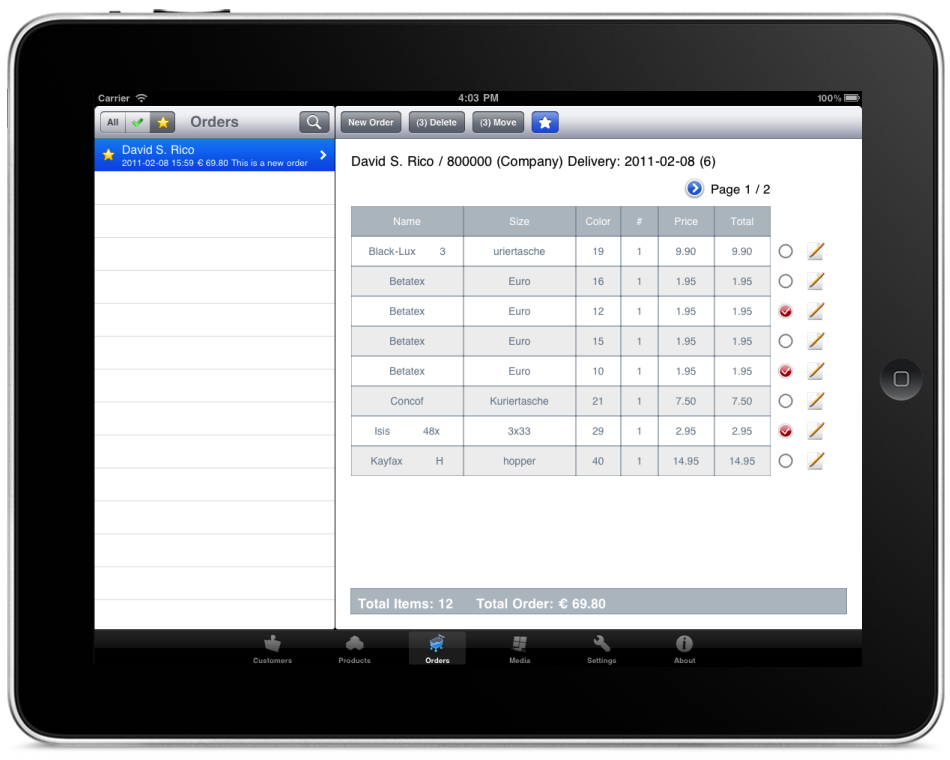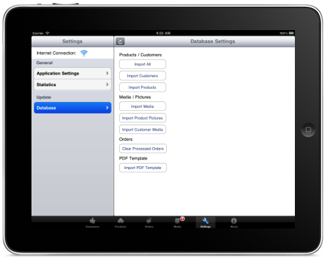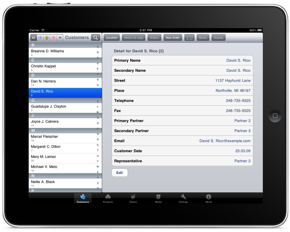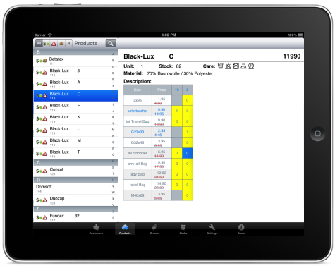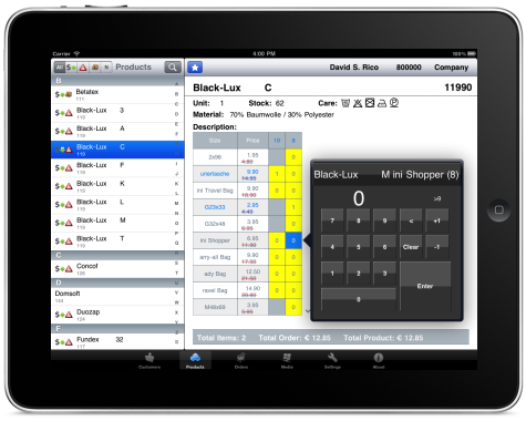 OrderPad is a mobile application for the iPad allowing a sales team to have full access to customer information like location, representatives and financial data of customers. With the integration of a full company product catalog, the sales team can input orders for the customer, create order confirmations in PDF format, send order confirmations and manage all orders from customers. The product catalog supports different price levels depending on the customer type, discount prices, out of stock warnings, end of life products. A portfolio of images can be associated with products and the sales team disposes over rich media product leaflets, catalogs in JPEG, PDF or video format. OrderPad is a multilanguage application. The user interface language will automatically adapt to the language setting in the Apple iPad iOS.2. Customers