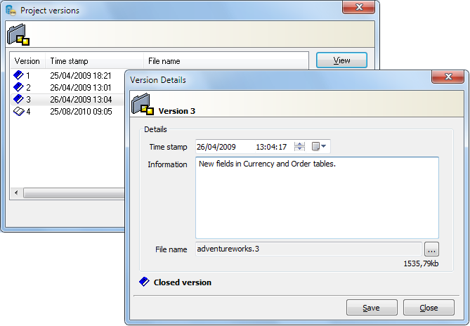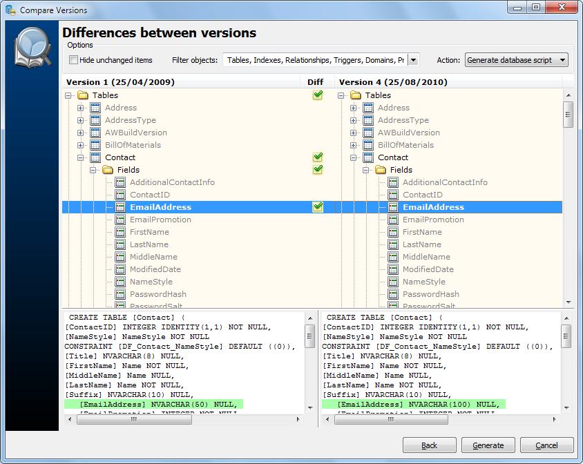 A full comparer is available for you to check the differences between two models. You can perform comparison between two versions, or even between two projects. The comparer provides a very friendly visual interface that shows the differences in a tree view and also in a SQL diff format. From the comparer you can choose which items you want to update to generate an Alter SQL script.