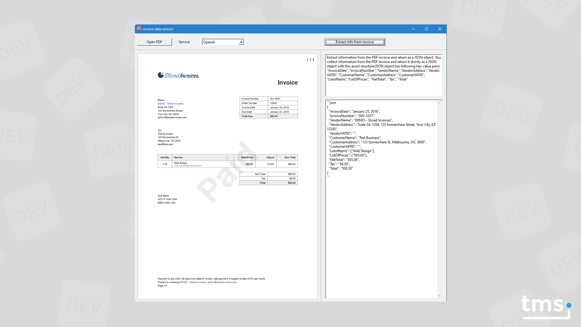With just a few lines of code and TMS AI Studio, you can extract invoice data using OpenAI, Gemini or Claude. No complex PDF parsing or OCR needed anymore! |