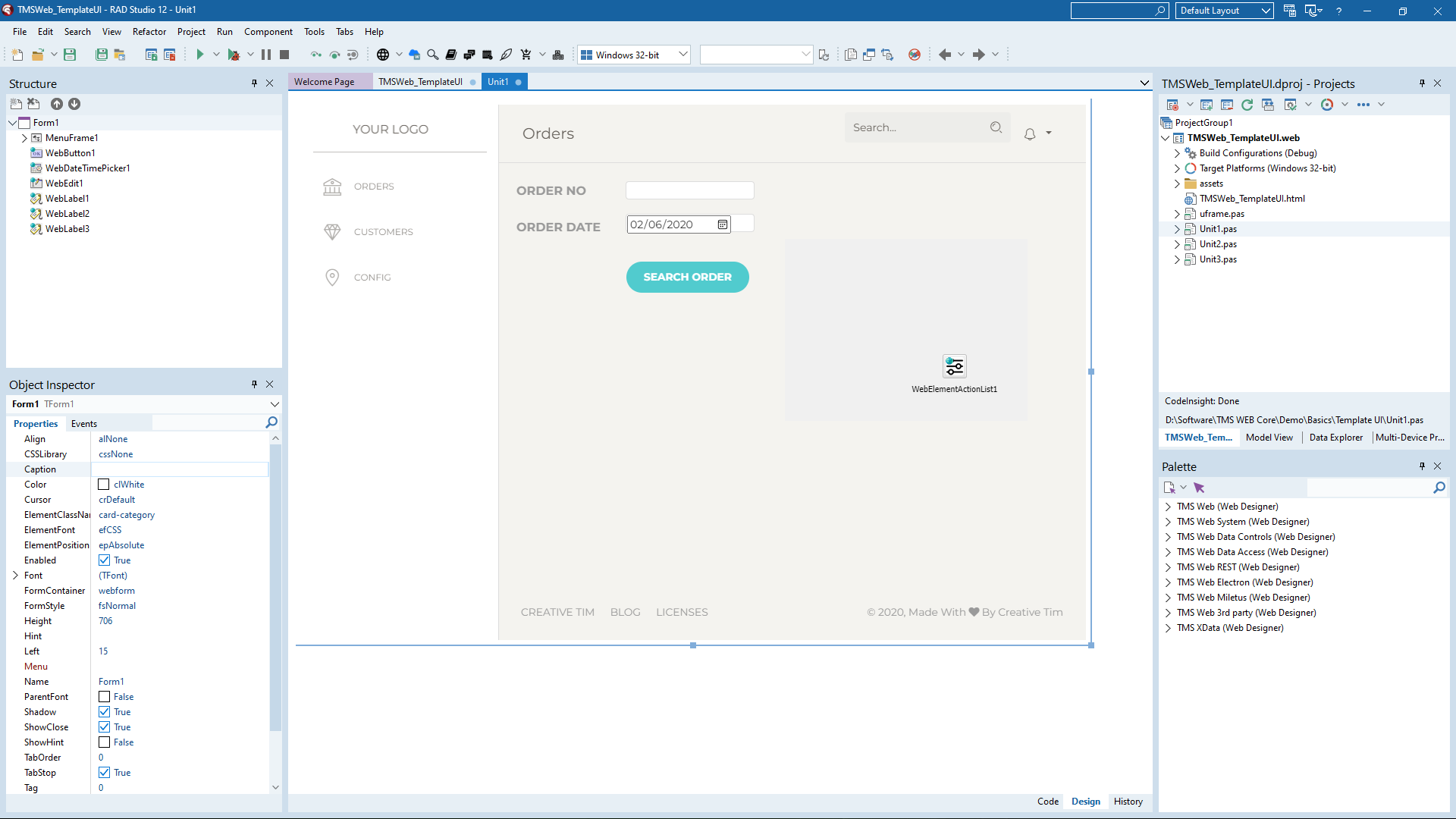 So, our team did not go an extra mile but in this case more like an extra hundred miles to do what no one did before: adding a web technology based form designer to the Delphi IDE! So, the web form designer is an embedded browser where you see our TMS WEB Core components live rendered and you can live interact with them from the Delphi IDE. You can resize the web form designer to see responsive behavior live from the IDE. You can see the effects of using CSS libraries like Bootstrap directly from the IDE. If you use HTML templates, you see these live in the IDE.