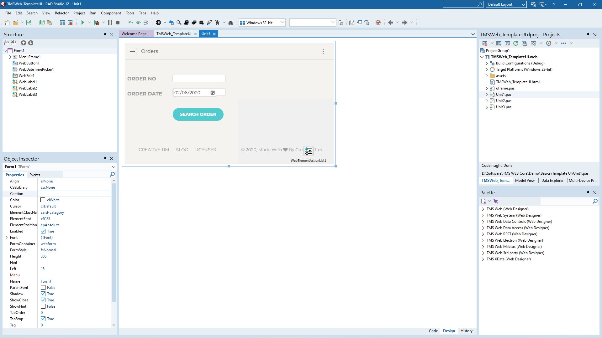 Our TMS WEB Core tool has so far leveraged the VCL form designer for visually creating your web forms and working with the UI controls from the IDE. The familiarity of the design methodology helped reducing the learning curve. But having only a VCL form designer to create pages ultimately rendered in the browser with HTML & CSS markup that not only styles the page but also introduces in most cases responsive behavior kept a kind of distance between design-time and run-time experience.