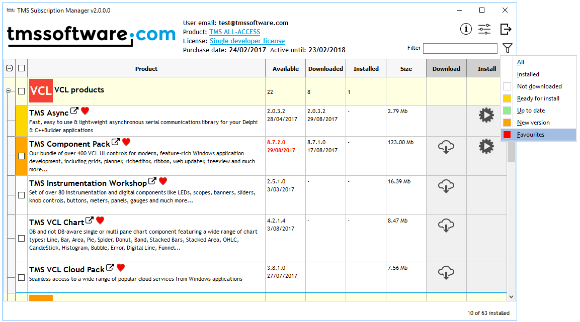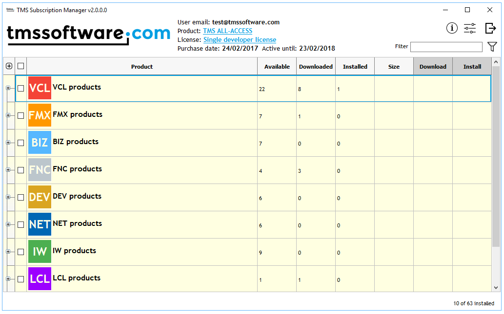 One comprehensive tool to manage any of the many bundle subscriptions you can purchase from TMS software was our goal for TMS Subscription Manager v2.0 that is now finally released. TMS Subscription Manager v2.0 supports TMS ALL-ACCESS, TMS VCL Subscription, TMS Business Subscription, TMS Component Studio, TMS FMX Component Studio, TMS FNC Component Studio and TMS IntraWeb Component Studio.With TMS Subscription Manager v2.0, you can use a single login in this application and you get instant access to all products in the purchased bundle. For TMS ALL-ACCESS, this is at this moment a whopping 63 products. The TMS Subscription Manager v2.0 now categorizes the products neatly per technology : VCL, FMX, BIZ, FNC, DEV, .NET, IntraWeb and LCL.