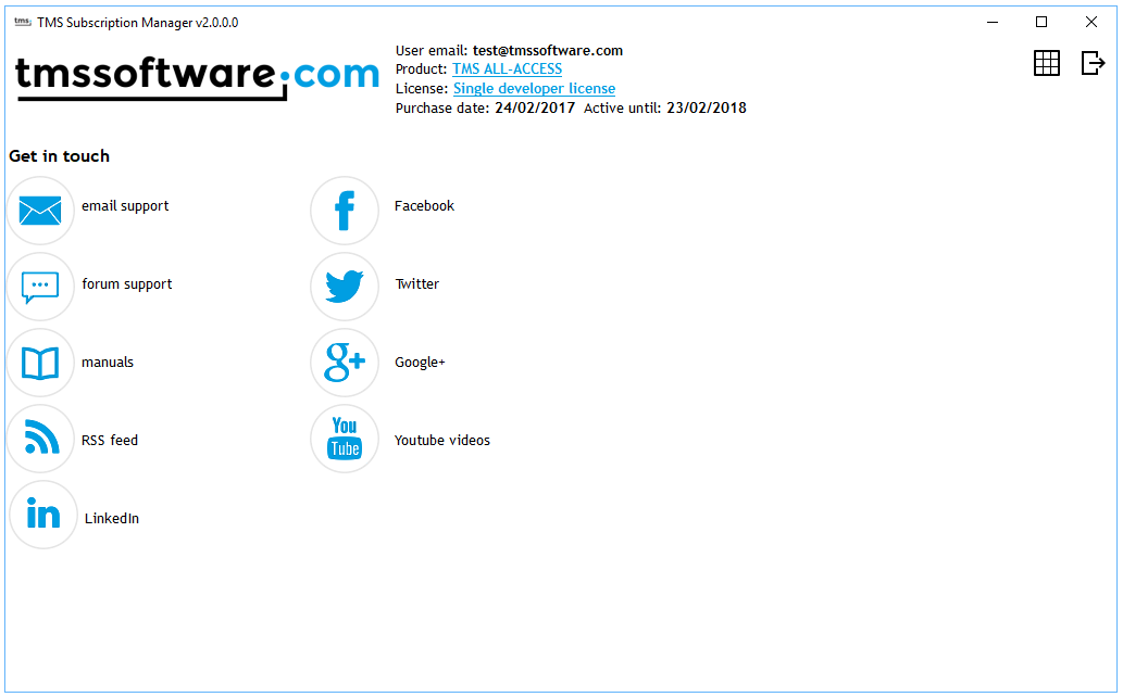 Finally, the TMS Subscription Manager v2.0 keeps you always informed about the validity of your subscription and will guide you to the renewal order upon expiry. Last but not least, from the TMS Subscription Manager there is a comprehensive list of links to interact with us, via email, social media, forums, RSS, Youtube videos ...