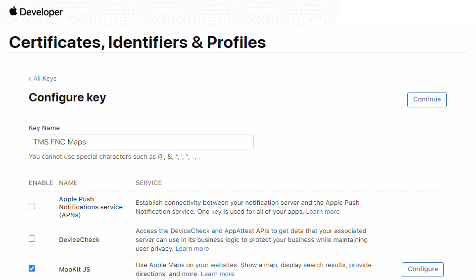 - The Key is displayed. For detailed information see https://developer.apple.com/documentation/mapkitjs/creating_a_maps_identifier_and_a_private_key