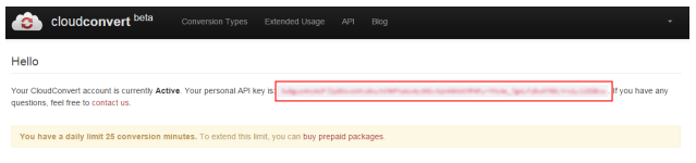Sign up for an account at: https://cloudconvert.com After login the API key is displayed on the user profile page: https://cloudconvert.com/user/profile