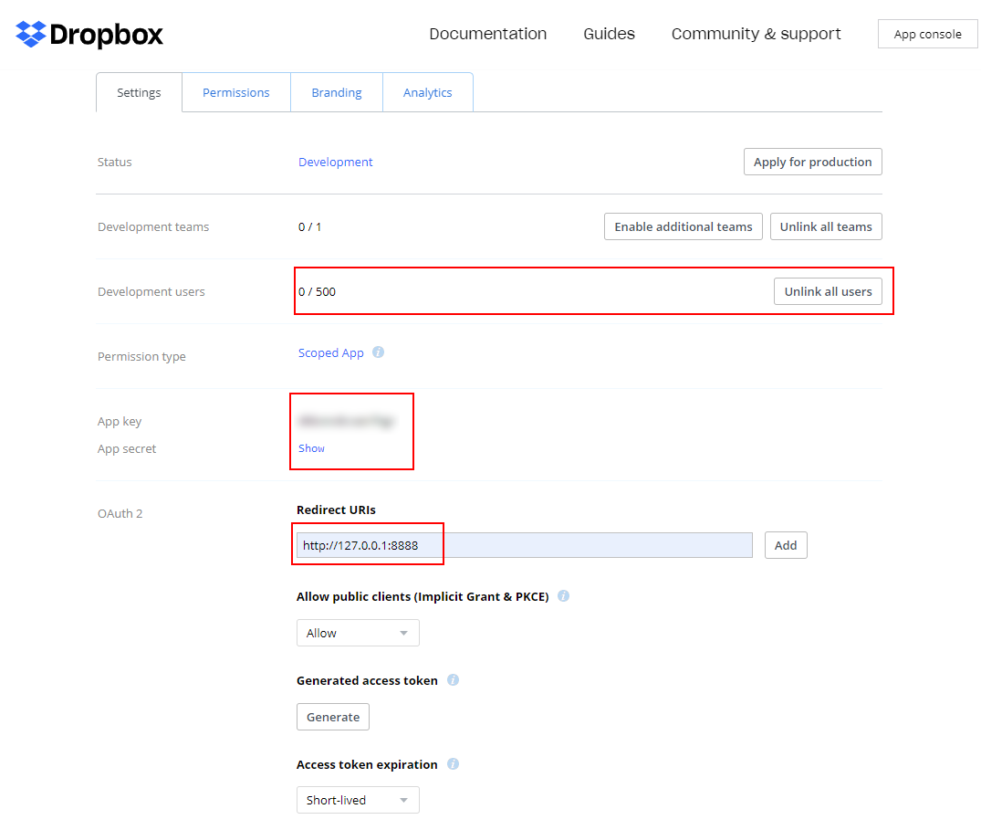 When confirming the creation of this app, you will see on the next page the application key and application secret. Make sure to add an URL to the list of 'Redirect URIs' that is identical to the App.CallBackURL property value.