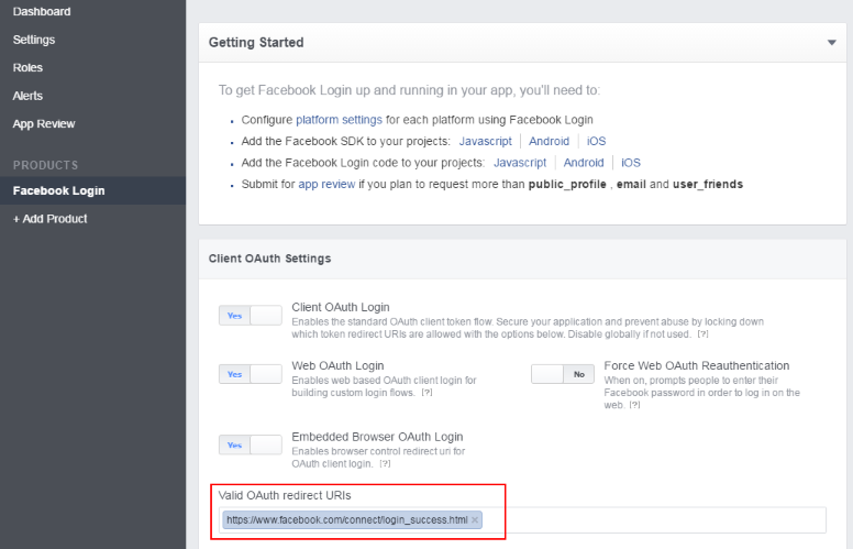 If not yet available, add the 'Facebook Login' on the 'Products' tab.