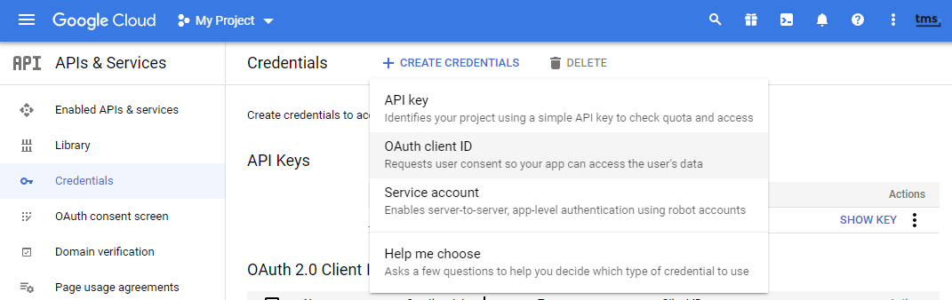 Then select 'Credentials' from the left menu, click 'Create credentials' and select "OAuth client ID".