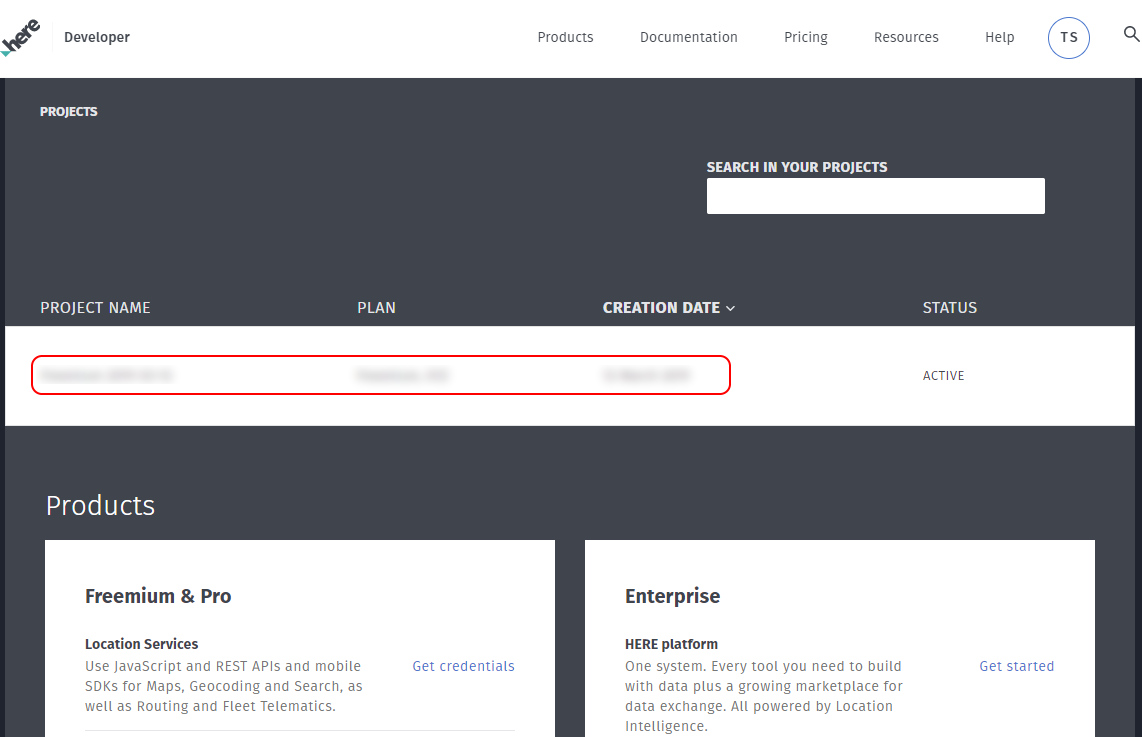 - Go to https://developer.here.com/projects and login