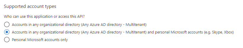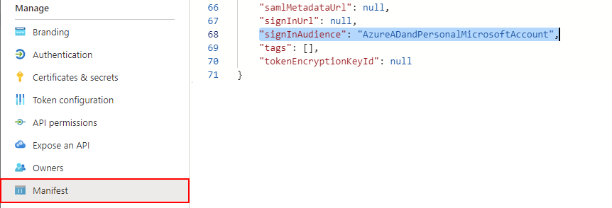 Note: To change the "Supported account types" option for an existing app, select "Manifest" and change "signInAudience" to "AzureADandPersonalMicrosoftAccount".