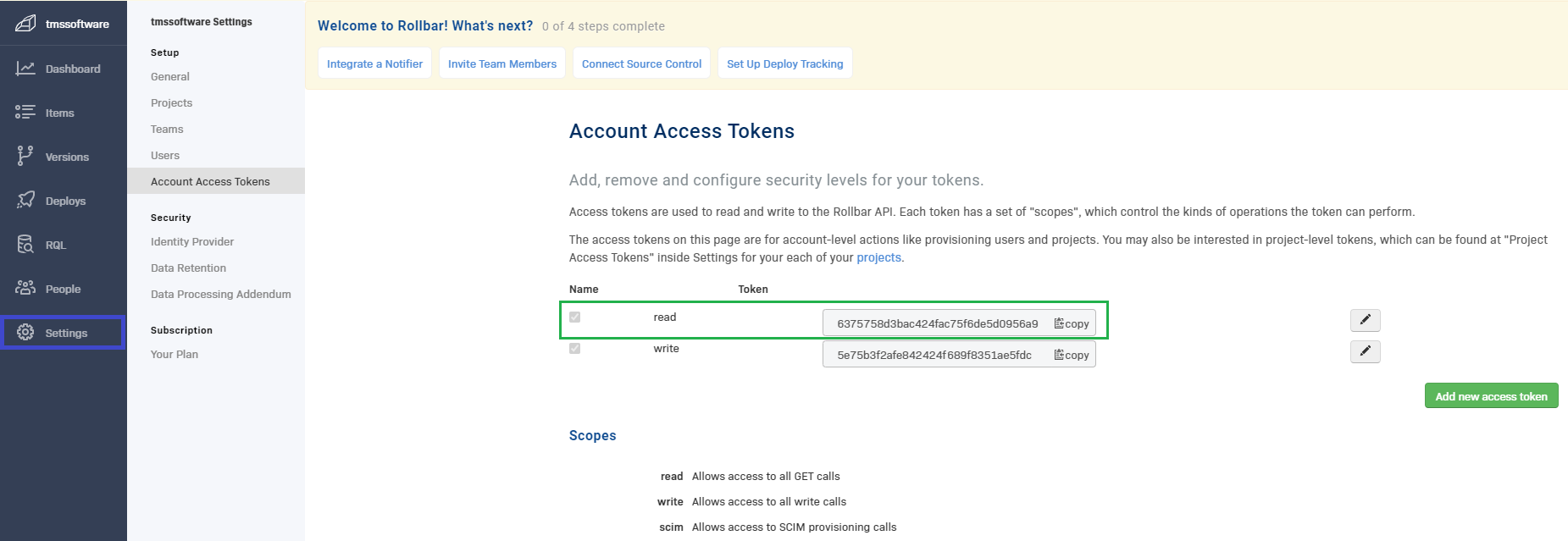 - Select the "ACCESS TOKENS" tab and add a new access token