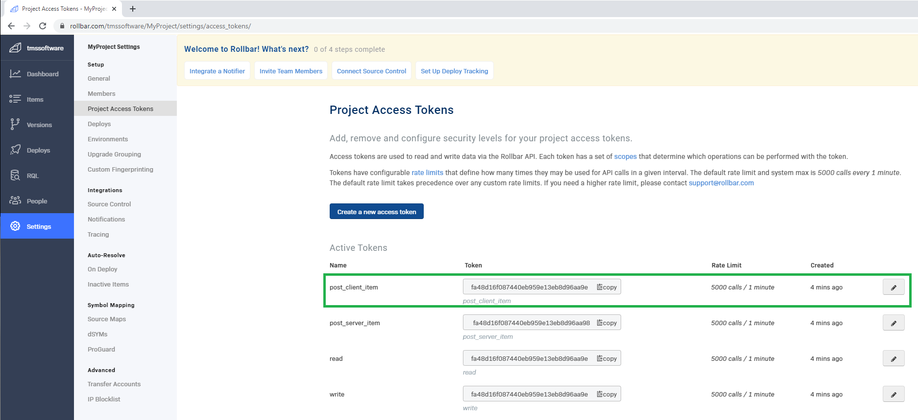 - If you want the use the ability to log messages and exceptions, You will need to make a project token available with the "post_client_item" scope.