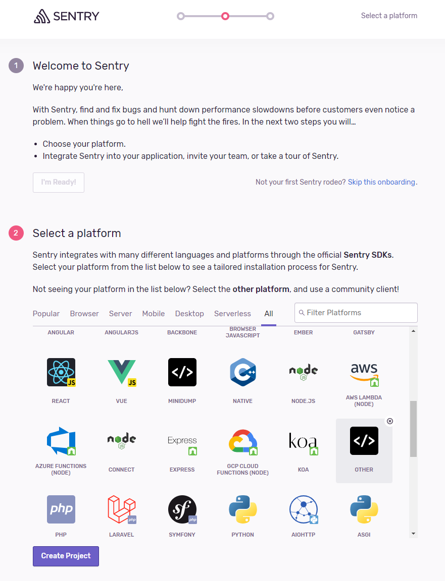 - Go to https://sentry.io/signup/ and create your account.