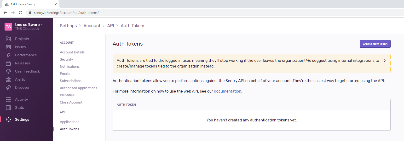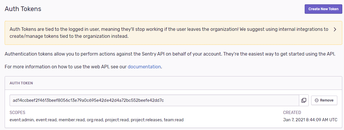 - Now you can login to the sentry website and create a token.