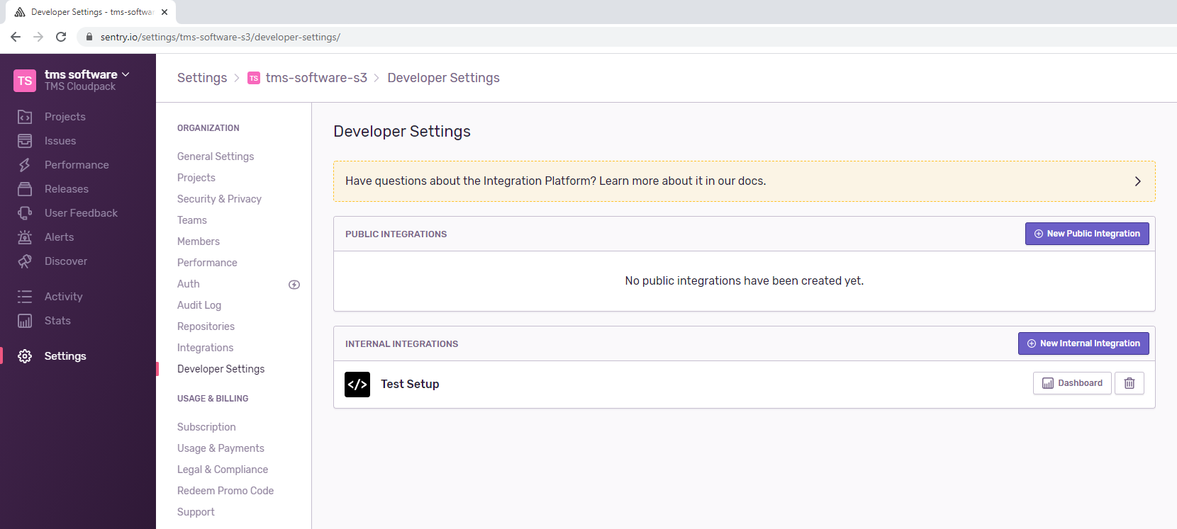 - In case you want to work with TMS WEB Core, it is best to create an internal integration to avoid CORS issues. Go to Settings > Developer Settings and "New Internal Integration".
