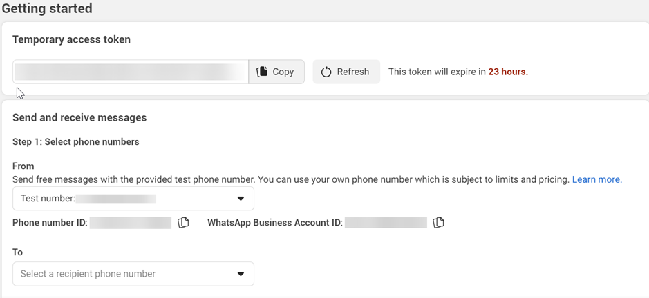 - You have now access to your temporary access tokens and a test number to start experimenting with the WhatsApp API.