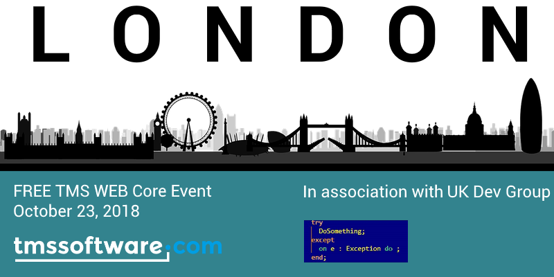 The event is FREE and we welcome UK Dev Group members, existing TMS software customers and future TMS software customers interested in doing modern web application development in their beloved Object Pascal language and from the beloved Delphi IDE.