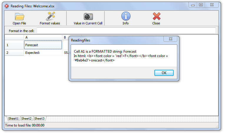 Reading an XLSX file with Flexcel with the "Reading Files" example, showing contents of a cell as HTML: