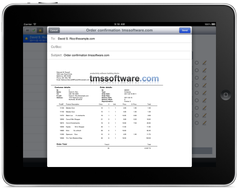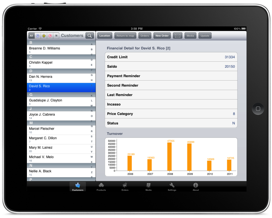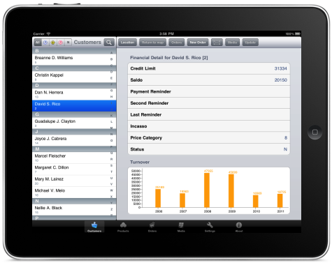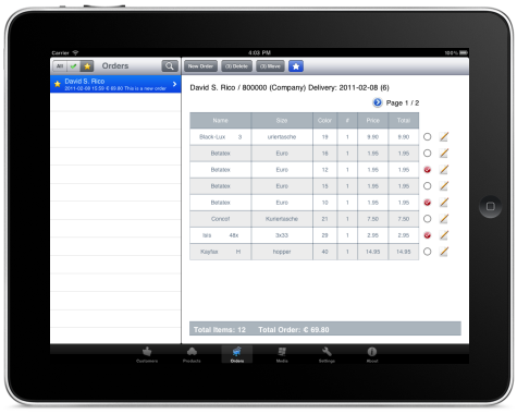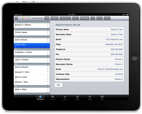 OrderPad is a mobile application for the iPad allowing a sales team to have full access to customer information like location, representatives and financial data of customers. With the integration of a full company product catalog, the sales team can input orders for the customer, create order confirmations in PDF format, send order confirmations and manage all orders from customers. The product catalog supports different price levels depending on the customer type, discount prices, out of stock warnings, end of life products. A portfolio of images can be associated with products and the sales team disposes over rich media product leaflets, catalogs in JPEG, PDF or video format. OrderPad is a multilanguage application. The user interface language will automatically adapt to the language setting in the Apple iPad iOS.2. Customers