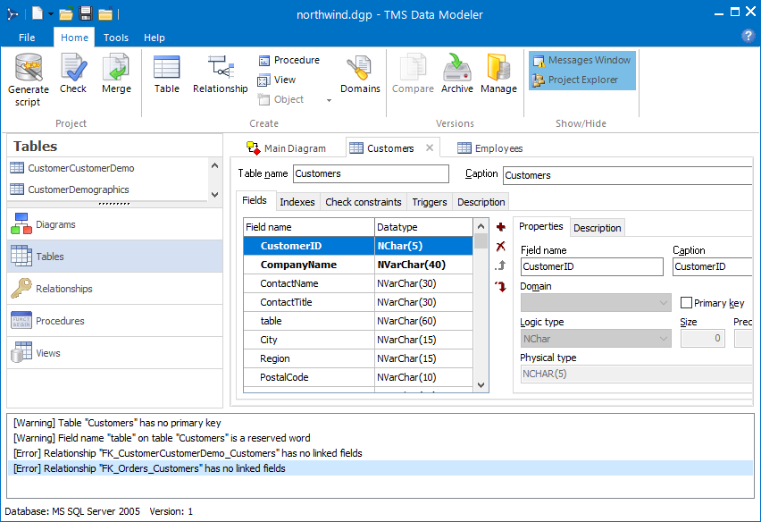 Everything in Data Modeler was designed to be easy. Objects are displayed in tabs, and creating and editing fields don't require you to open another window. Everything is simple, clean and accessible through keyboard in a single window. Create your tables and fields quickly.