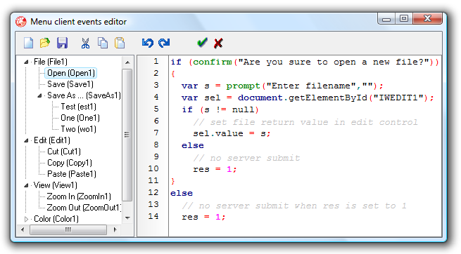 This design time client-side script editors enable easy Javascript editing with Javascript syntax highlighting. The client-side script editors are used to edit menus, calendar, grids, edits and other TMS IntraWeb components.