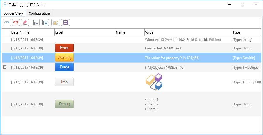 - Separate TCP/IP Client included to view logger outputs remotely or TCP/IP server to log outputs of multiple client apps