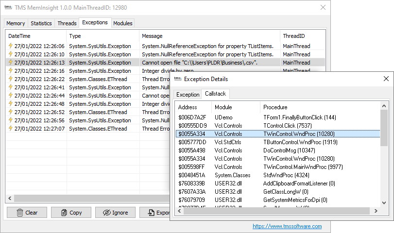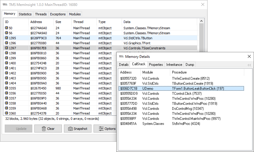 Delphi run-time memory allocation inspection, exception call stack logging, thread inspection and more